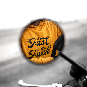 The shop's been looking a little drab lately. We thought we'd spice things up a little with this old gold heavyweight Fast As Fuck pullover hoodie. This 13.8 oz pullover has a double fleece lined hood and sports our cheeky Fast As Fuck graphic on the front as well as a small lightning bolt on the right sleeve, cause you know, that's yer throttle hand.