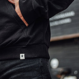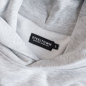 An extremely heavyweight daily hoodie from Steeltown. We wanted to make a low-key, everyday pullover that would get you through the winter in style. This small-batch 24oz cotton hoodie features our classic embroidered bolt tag on the bottom hem, a high collar to keep your neck warm, no annoying drawstrings, a kangaroo pocket, and a fleece inside.